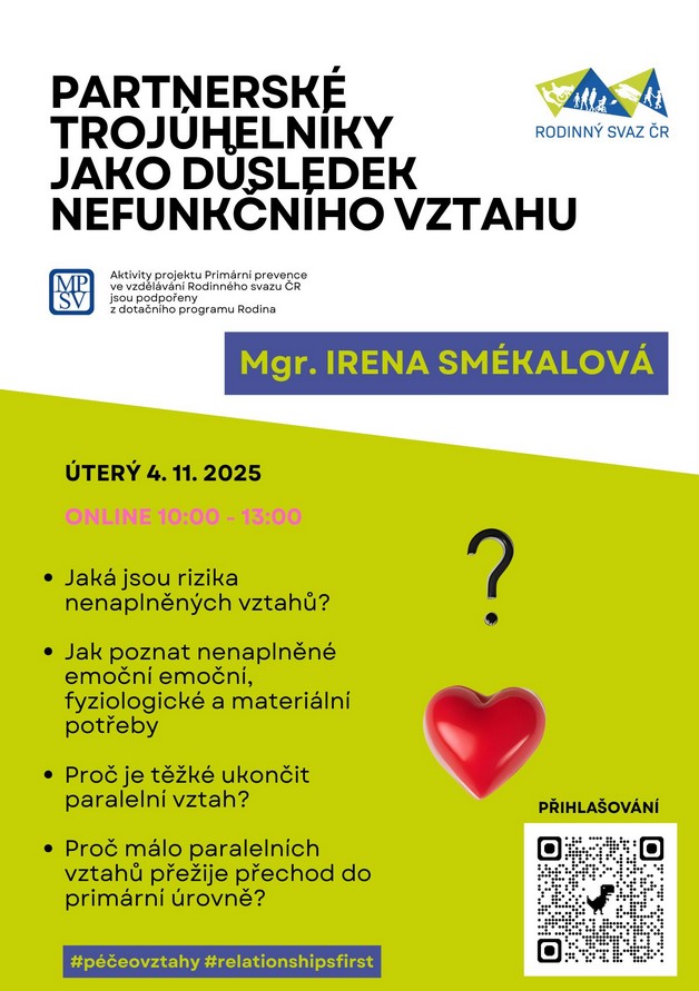 Rodinný svaz ČR pokračuje další aktivitou v realizaci projektu s podporou MPSV „Primární prevence ve vzdělávání RS ČR“. Jeho cílem je zkvalitnění programů členských center Rodinného svazu, a to prostřednictvím vzdělávacích aktivit, které byly doporučeny samotnými centry v rámci předprojektového dotazování. Přednáška „Závislost na PC, telefonech, tabletech a jejich prevence“ se uskutečnila 22. října 2025.