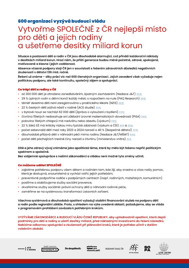 Dítě a rodina nejsou okrajové téma — jsou klíčem k budoucnosti celé země. Rodinný svaz se připojuje k výzvě zákonodárcům a budoucí vládě, aby učinili kroky, které zajistí skutečnou podporu rodinám, prevenci problémů a stabilní financování služeb pro děti, jejich rodiče a celé rodiny.